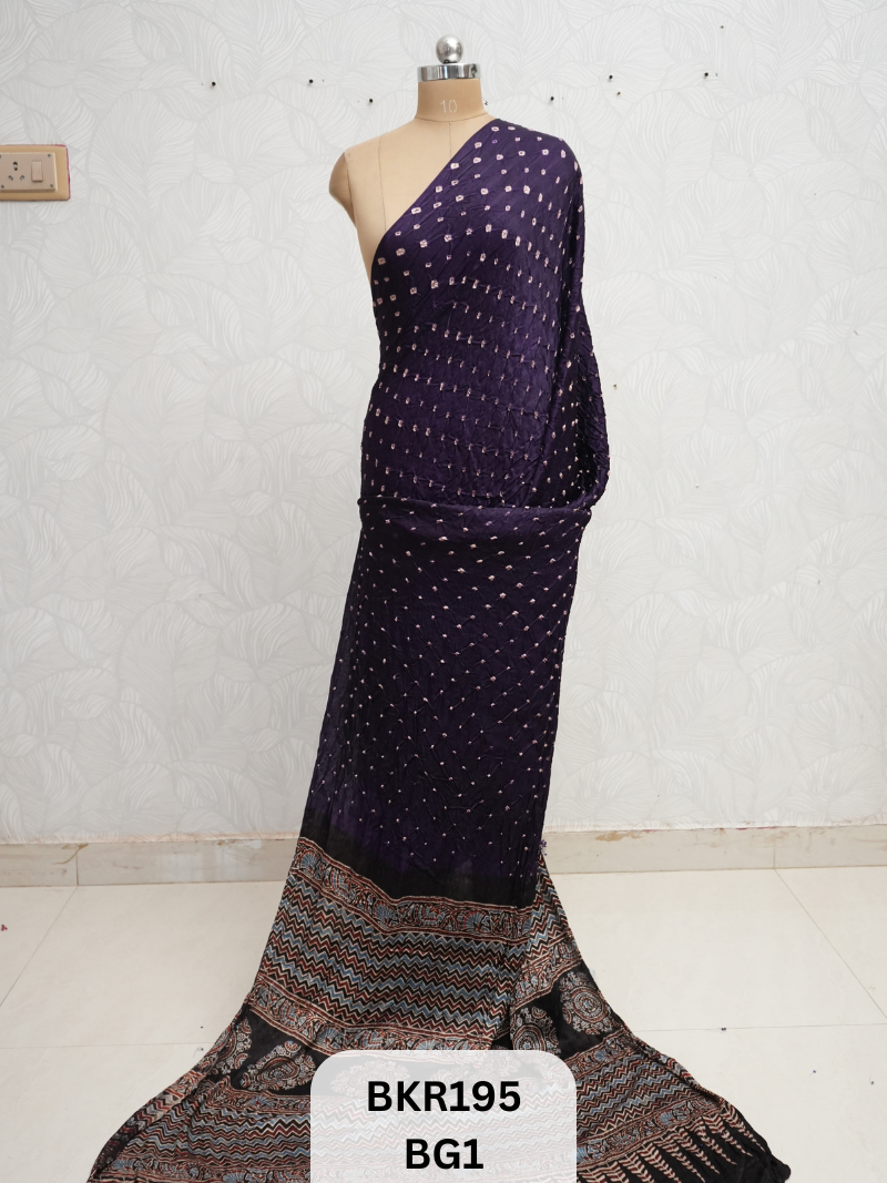 A: It’s a handcrafted cotton saree blending Gujarat’s tie-dye Bandhani technique with Rajasthan’s natural-dye Ajrakh block printing—celebrating two UNESCO-recognized Indian textile arts in one borderless drape.