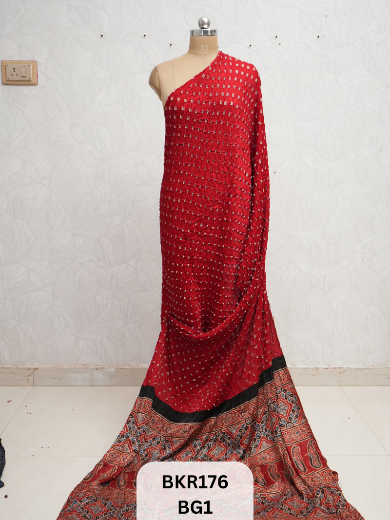 A: It’s a handcrafted cotton saree blending Gujarat’s tie-dye Bandhani technique with Rajasthan’s natural-dye Ajrakh block printing—celebrating two UNESCO-recognized Indian textile arts in one borderless drape.