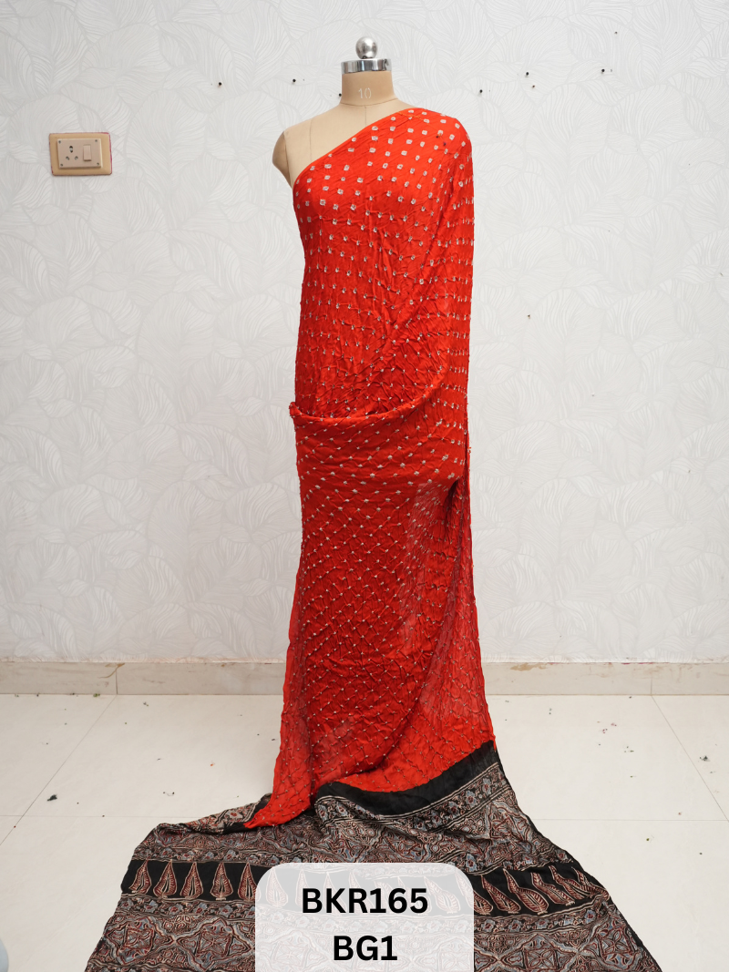🎨 Dual Heritage Craft: Handcrafted Bandhani (tie-dye) meets intricate Ajrakh block printing in a seamless, borderless drape.