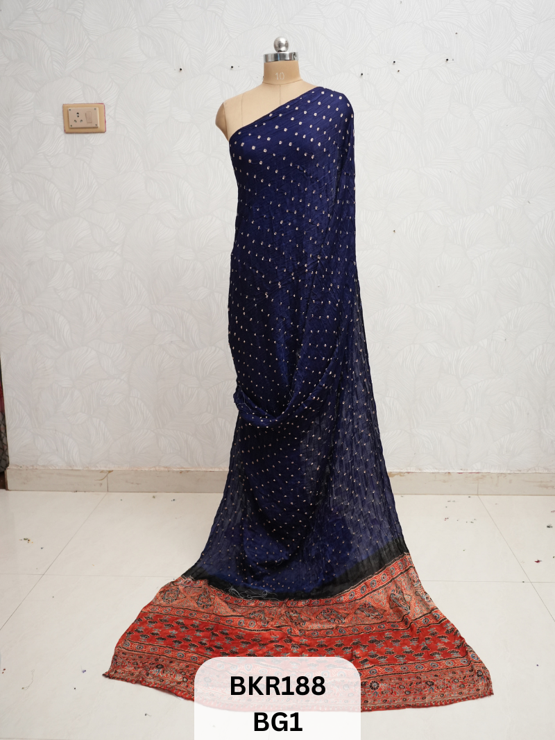 A: It’s a handcrafted cotton saree blending Gujarat’s tie-dye Bandhani technique with Rajasthan’s natural-dye Ajrakh block printing—celebrating two UNESCO-recognized Indian textile arts in one borderless drape.