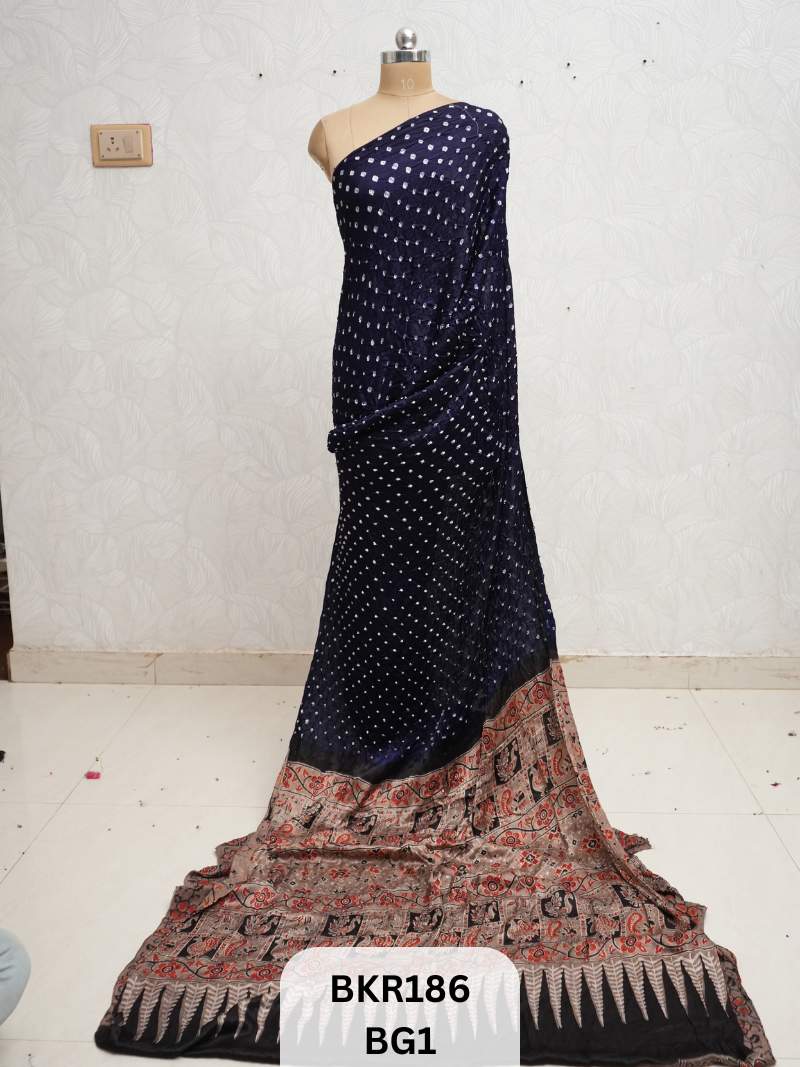 A: It’s a handcrafted cotton saree blending Gujarat’s tie-dye Bandhani technique with Rajasthan’s natural-dye Ajrakh block printing—celebrating two UNESCO-recognized Indian textile arts in one borderless drape.