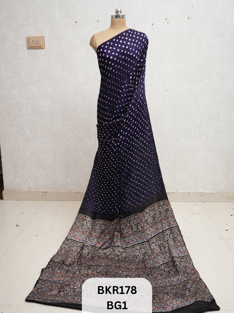 A: It’s a handcrafted cotton saree blending Gujarat’s tie-dye Bandhani technique with Rajasthan’s natural-dye Ajrakh block printing—celebrating two UNESCO-recognized Indian textile arts in one borderless drape.