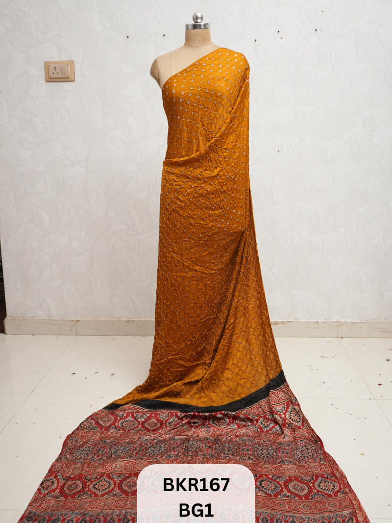 🎨 Dual Heritage Craft: Handcrafted Bandhani (tie-dye) meets intricate Ajrakh block printing in a seamless, borderless drape.