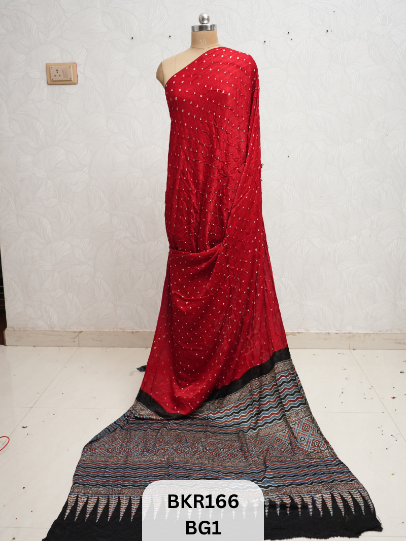 A: It’s a handcrafted cotton saree blending Gujarat’s tie-dye Bandhani technique with Rajasthan’s natural-dye Ajrakh block printing—celebrating two UNESCO-recognized Indian textile arts in one borderless drape.