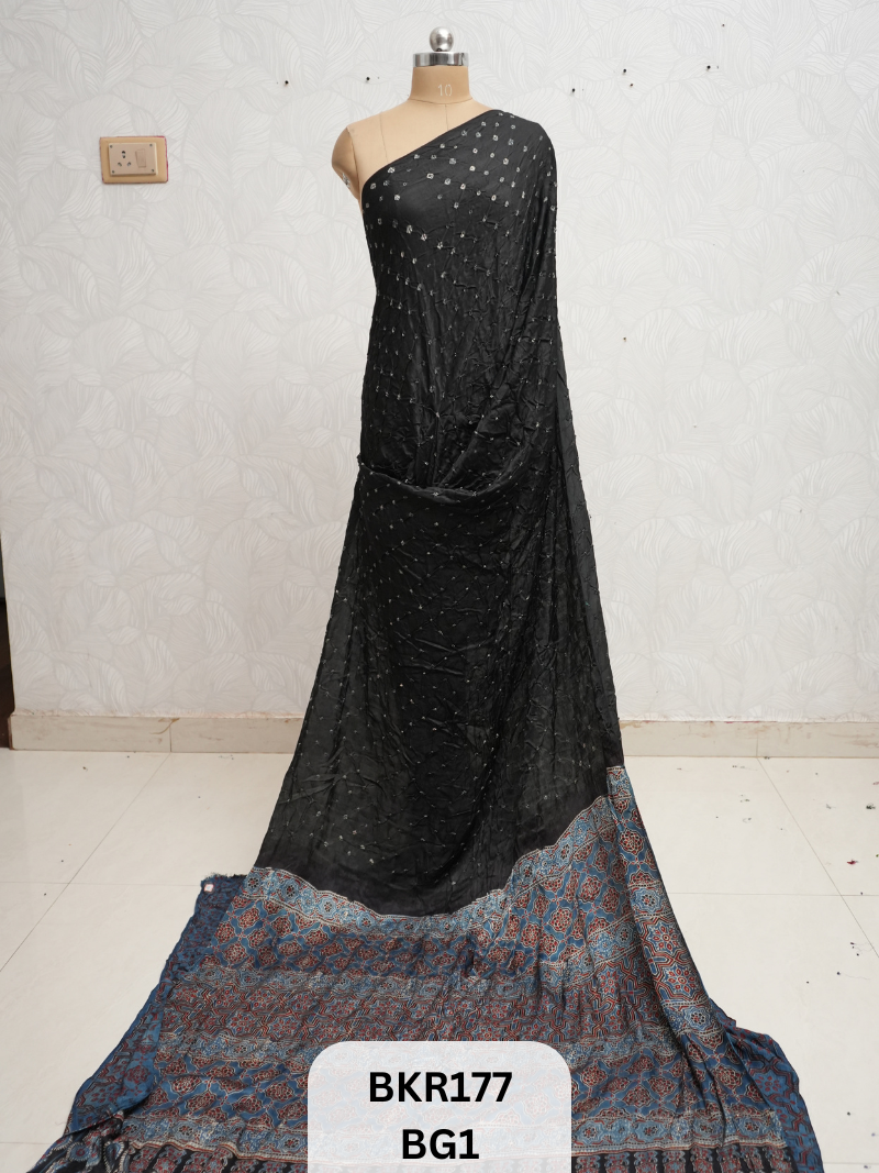 A: It’s a handcrafted cotton saree blending Gujarat’s tie-dye Bandhani technique with Rajasthan’s natural-dye Ajrakh block printing—celebrating two UNESCO-recognized Indian textile arts in one borderless drape.