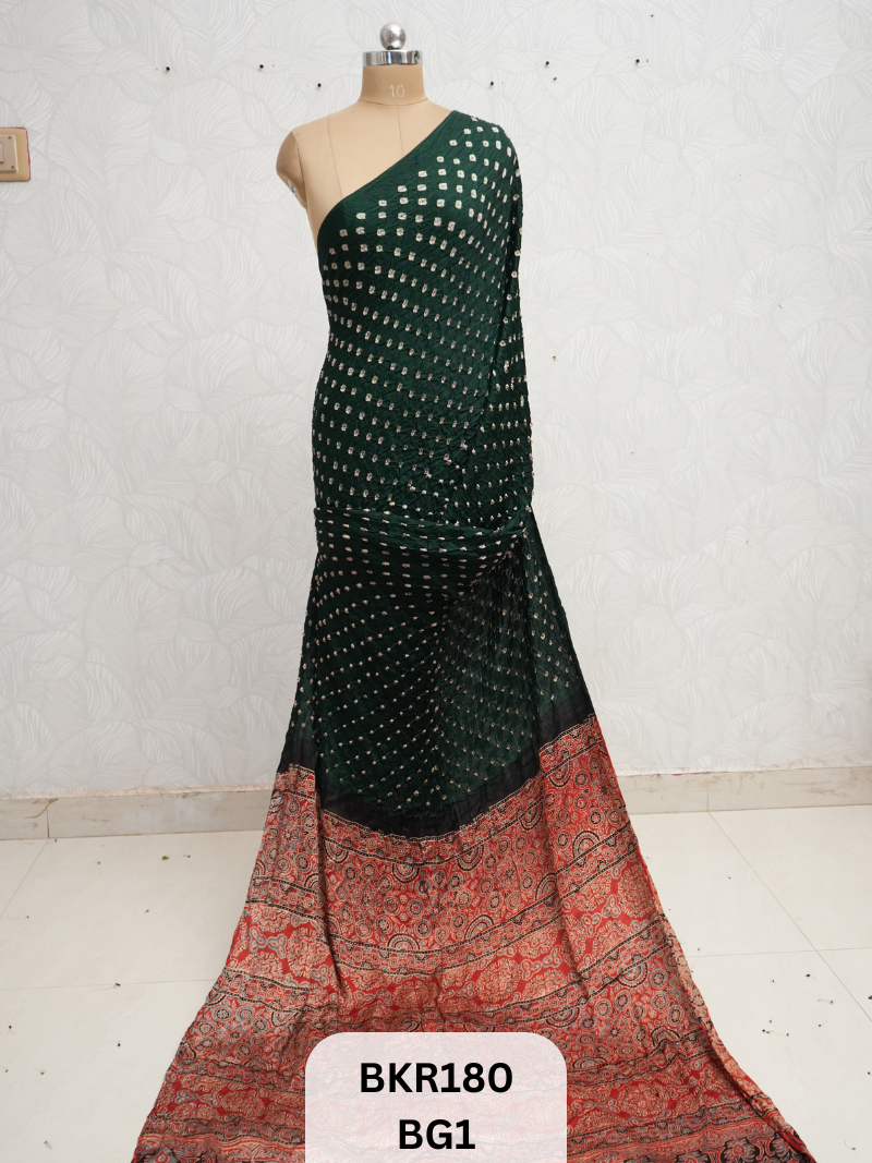 A: It’s a handcrafted cotton saree blending Gujarat’s tie-dye Bandhani technique with Rajasthan’s natural-dye Ajrakh block printing—celebrating two UNESCO-recognized Indian textile arts in one borderless drape.