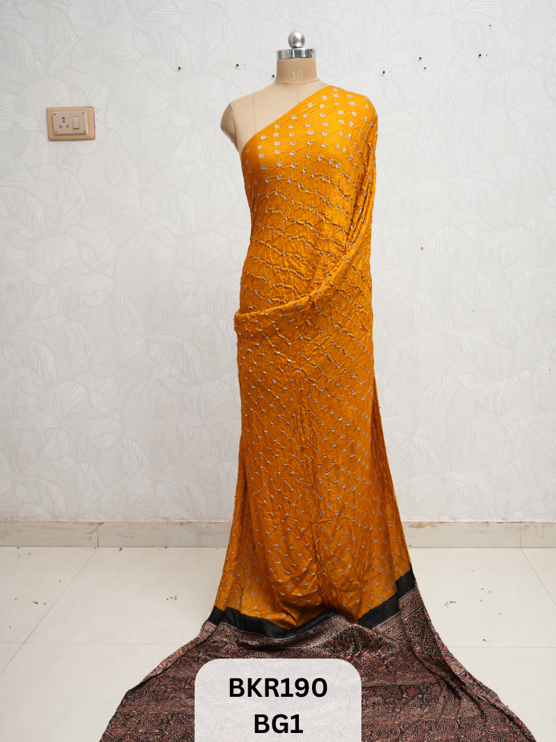 A: It’s a handcrafted cotton saree blending Gujarat’s tie-dye Bandhani technique with Rajasthan’s natural-dye Ajrakh block printing—celebrating two UNESCO-recognized Indian textile arts in one borderless drape.