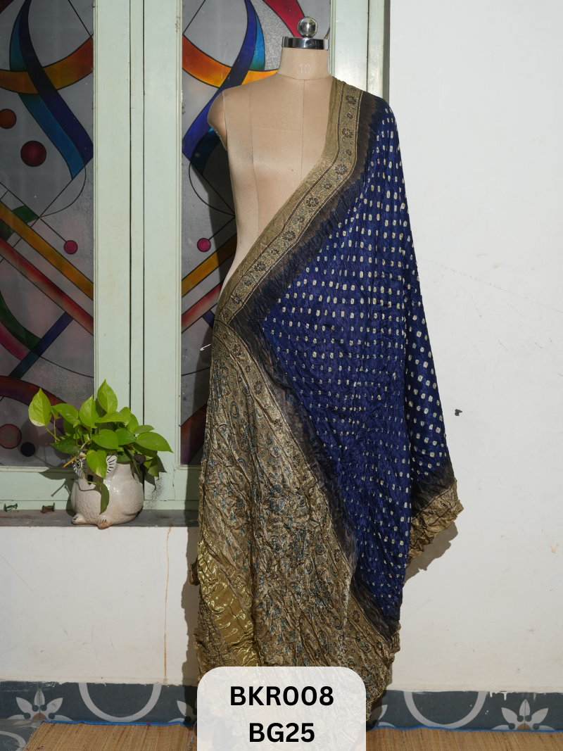 Bandhani, originating over 5,000 years ago in the deserts of Gujarat and Rajasthan, symbolizes joy, prosperity, and auspicious beginnings—often worn by brides and during festivals. Ajrakh, with roots in the Indus Valley Civilization (c. 2500 BCE), is a resist-dye block printing technique practiced by the Khatri community of Kutch and Sindh, known for its intricate geometric patterns and deep indigo hues derived from natural sources like indigo, madder, and pomegranate.