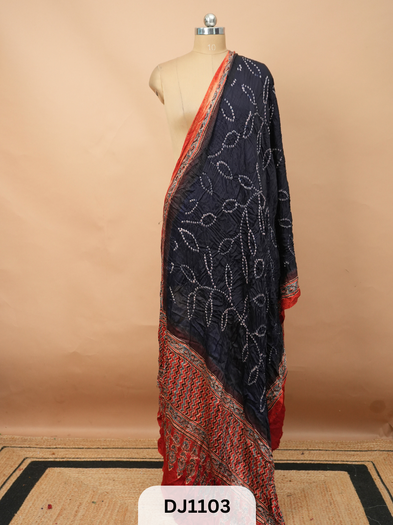 A: It’s a handcrafted cotton dupatta that uniquely combines Gujarati Bandhani (tie-dye) with Sindhi Ajrakh (natural block printing), representing two of India’s oldest textile traditions in one wearable art piece.