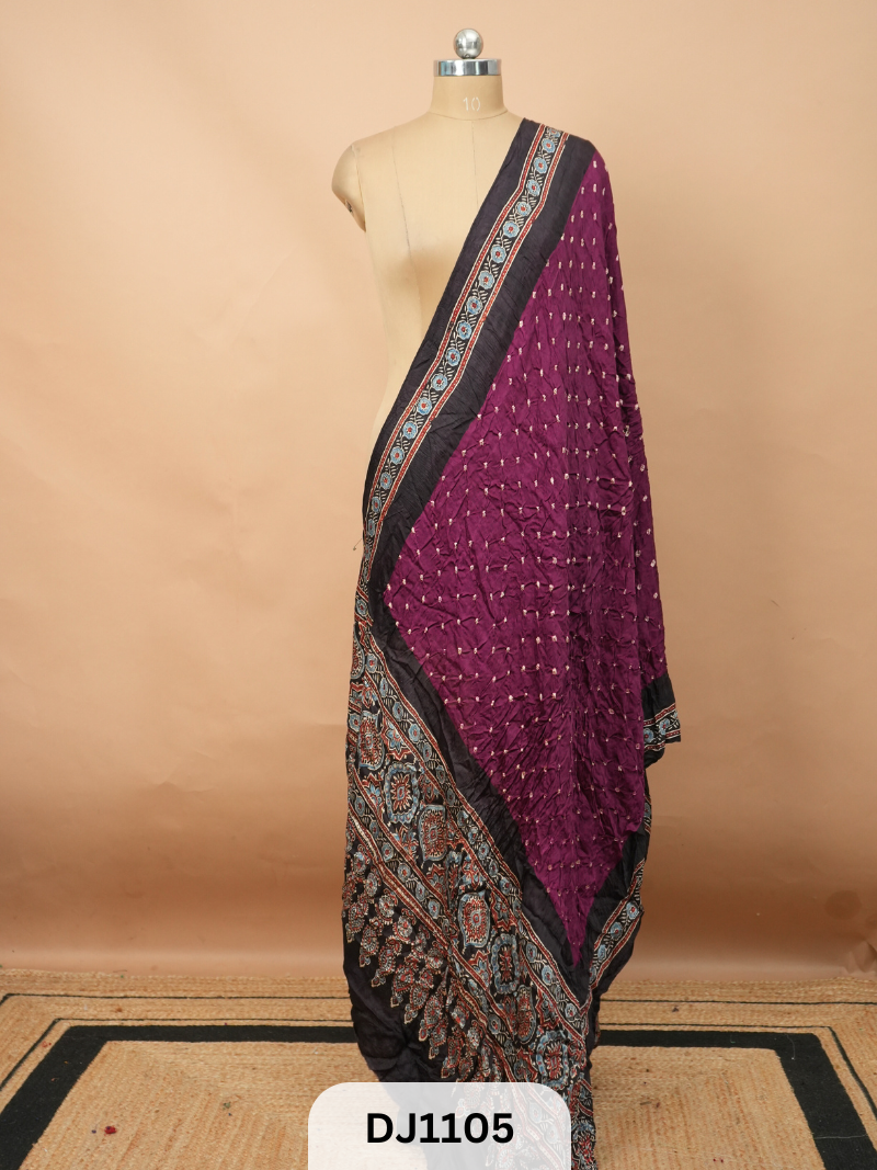 A: It’s a handcrafted cotton dupatta that uniquely combines Gujarati Bandhani (tie-dye) with Sindhi Ajrakh (natural block printing), representing two of India’s oldest textile traditions in one wearable art piece.