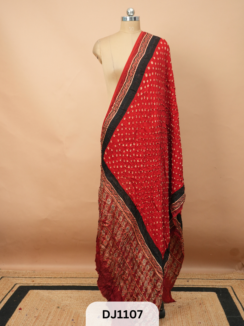 A: It’s a handcrafted cotton dupatta that uniquely combines Gujarati Bandhani (tie-dye) with Sindhi Ajrakh (natural block printing), representing two of India’s oldest textile traditions in one wearable art piece.