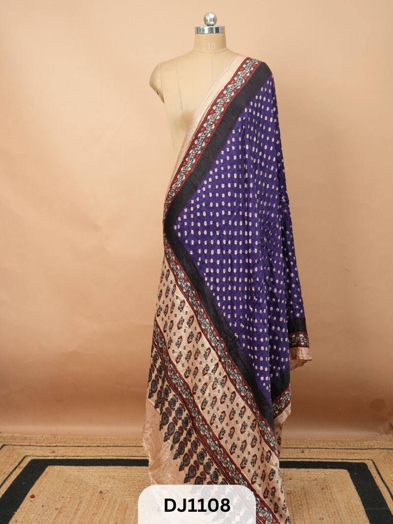 A: It’s a handcrafted cotton dupatta that uniquely combines Gujarati Bandhani (tie-dye) with Sindhi Ajrakh (natural block printing), representing two of India’s oldest textile traditions in one wearable art piece.