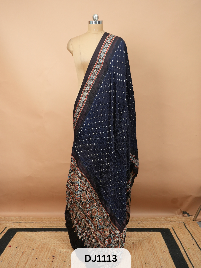 A: It’s a handcrafted cotton dupatta that uniquely combines Gujarati Bandhani (tie-dye) with Sindhi Ajrakh (natural block printing), representing two of India’s oldest textile traditions in one wearable art piece.