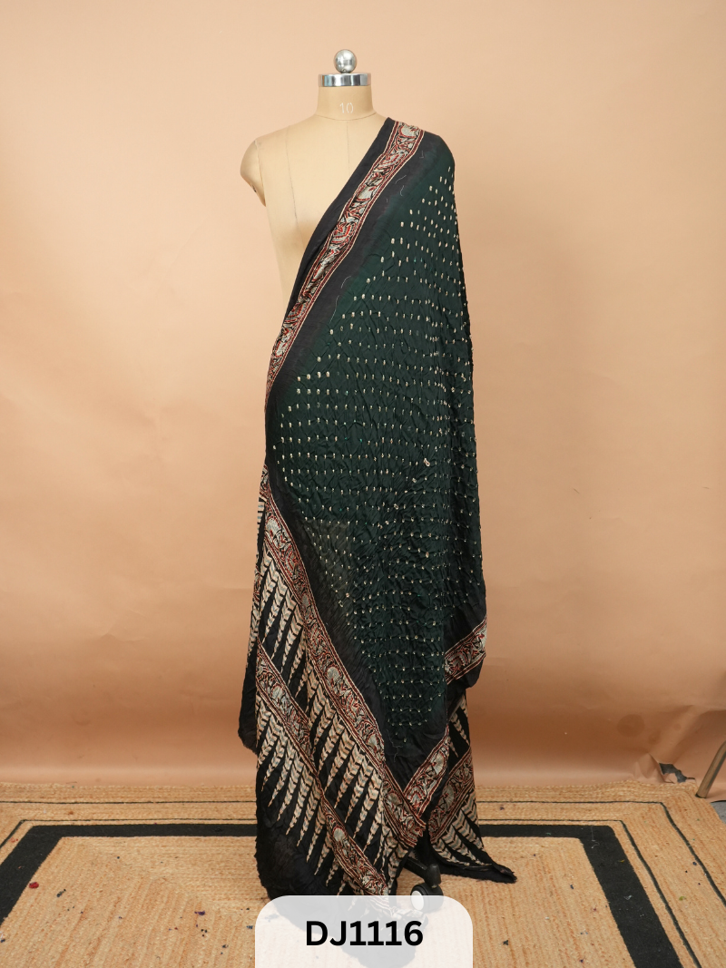 A: It’s a handcrafted cotton dupatta that uniquely combines Gujarati Bandhani (tie-dye) with Sindhi Ajrakh (natural block printing), representing two of India’s oldest textile traditions in one wearable art piece.