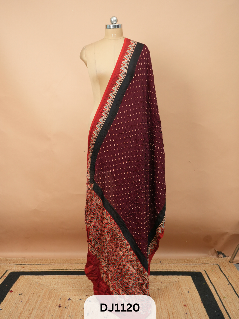 A: It’s a handcrafted cotton dupatta that uniquely combines Gujarati Bandhani (tie-dye) with Sindhi Ajrakh (natural block printing), representing two of India’s oldest textile traditions in one wearable art piece.