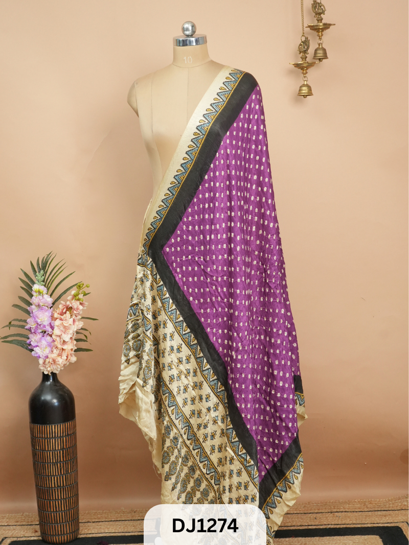 A: It’s a handcrafted cotton dupatta that uniquely combines Gujarati Bandhani (tie-dye) with Sindhi Ajrakh (natural block printing), representing two of India’s oldest textile traditions in one wearable art piece.
