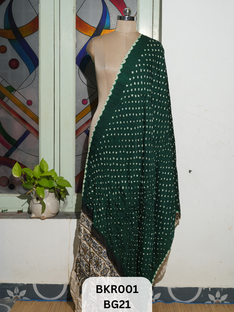 A: It’s a unique handcrafted dupatta that combines Bandhani (tie-dye from Gujarat) and Ajrakh (natural block printing from Kutch/Sindh) using eco-friendly dyes—resulting in a borderless, heritage-rich accessory perfect for ethnic ensembles.
