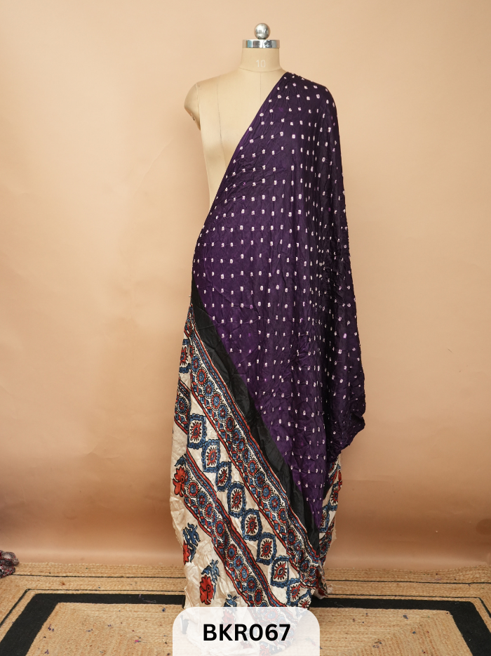 Bandhani, originating over 5,000 years ago in the deserts of Gujarat and Rajasthan, symbolizes joy, prosperity, and auspicious beginnings—often worn by brides and during festivals. Ajrakh, with roots in the Indus Valley Civilization (c. 2500 BCE), is a resist-dye block printing technique practiced by the Khatri community of Kutch and Sindh, known for its intricate geometric patterns and deep indigo hues derived from natural sources like indigo, madder, and pomegranate.