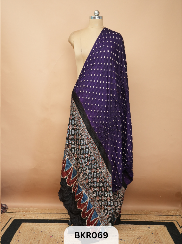 Bandhani, originating over 5,000 years ago in the deserts of Gujarat and Rajasthan, symbolizes joy, prosperity, and auspicious beginnings—often worn by brides and during festivals. Ajrakh, with roots in the Indus Valley Civilization (c. 2500 BCE), is a resist-dye block printing technique practiced by the Khatri community of Kutch and Sindh, known for its intricate geometric patterns and deep indigo hues derived from natural sources like indigo, madder, and pomegranate.