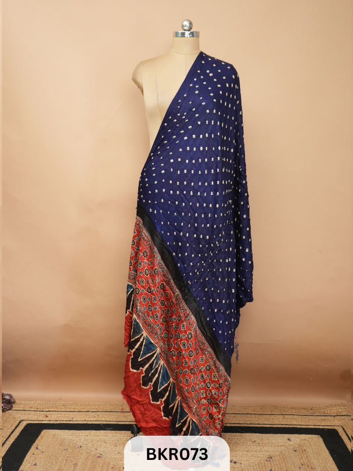 A: It’s a handcrafted cotton dupatta that uniquely combines Gujarati Bandhani (tie-dye) with Sindhi Ajrakh (natural block printing), representing two of India’s oldest textile traditions in one wearable art piece.