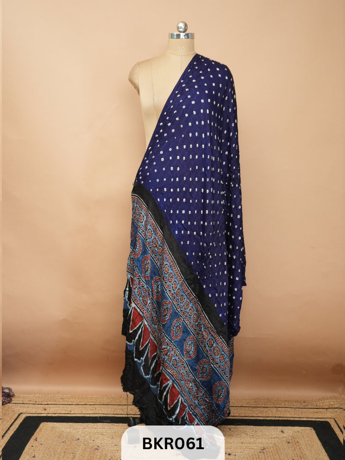 A: It’s a handcrafted cotton dupatta that uniquely combines Gujarati Bandhani (tie-dye) with Sindhi Ajrakh (natural block printing), representing two of India’s oldest textile traditions in one wearable art piece.