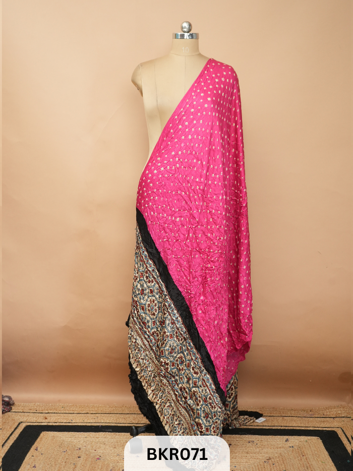 A: It’s a handcrafted cotton dupatta that uniquely combines Gujarati Bandhani (tie-dye) with Sindhi Ajrakh (natural block printing), representing two of India’s oldest textile traditions in one wearable art piece.