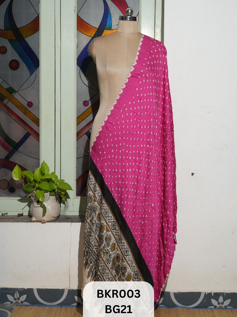 A: It’s a unique handcrafted dupatta that combines Bandhani (tie-dye from Gujarat) and Ajrakh (natural block printing from Kutch/Sindh) using eco-friendly dyes—resulting in a borderless, heritage-rich accessory perfect for ethnic ensembles.