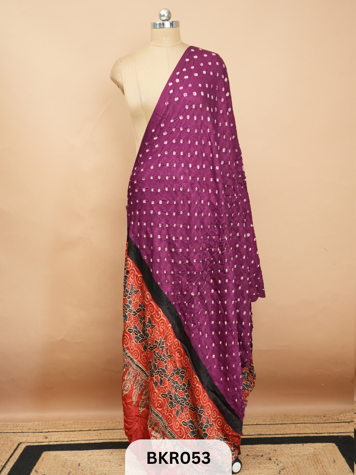 A: It’s a handcrafted cotton dupatta that uniquely combines Gujarati Bandhani (tie-dye) with Sindhi Ajrakh (natural block printing), representing two of India’s oldest textile traditions in one wearable art piece.