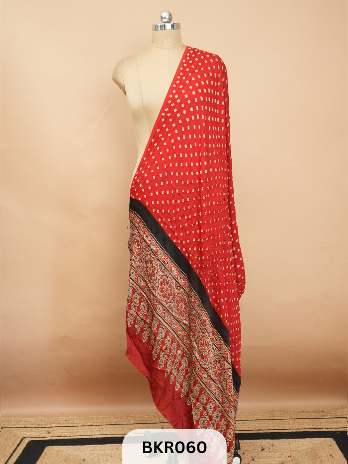 A: It’s a handcrafted cotton dupatta that uniquely combines Gujarati Bandhani (tie-dye) with Sindhi Ajrakh (natural block printing), representing two of India’s oldest textile traditions in one wearable art piece.