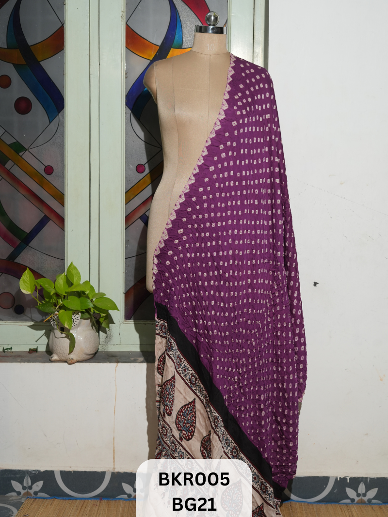 A: It’s a unique handcrafted dupatta that combines Bandhani (tie-dye from Gujarat) and Ajrakh (natural block printing from Kutch/Sindh) using eco-friendly dyes—resulting in a borderless, heritage-rich accessory perfect for ethnic ensembles.