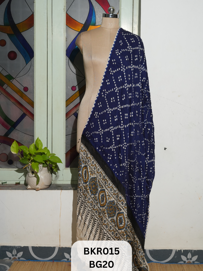 A: It’s a handcrafted cotton dupatta that uniquely combines Gujarati Bandhani (tie-dye) with Sindhi Ajrakh (natural block printing), representing two of India’s oldest textile traditions in one wearable art piece.