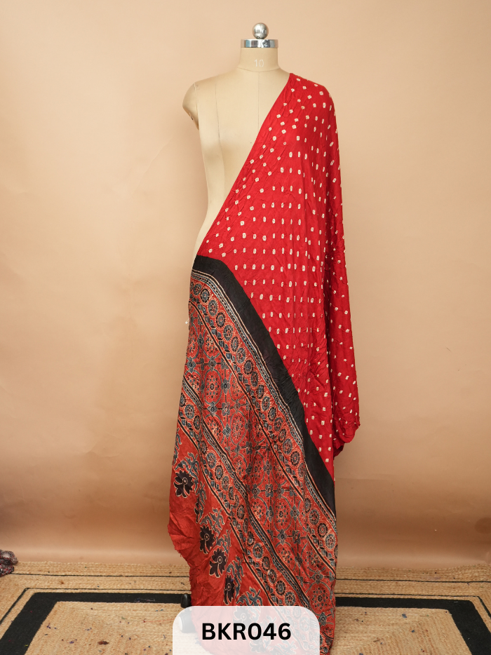 A: It’s a handcrafted cotton dupatta that uniquely combines Gujarati Bandhani (tie-dye) with Sindhi Ajrakh (natural block printing), representing two of India’s oldest textile traditions in one wearable art piece.