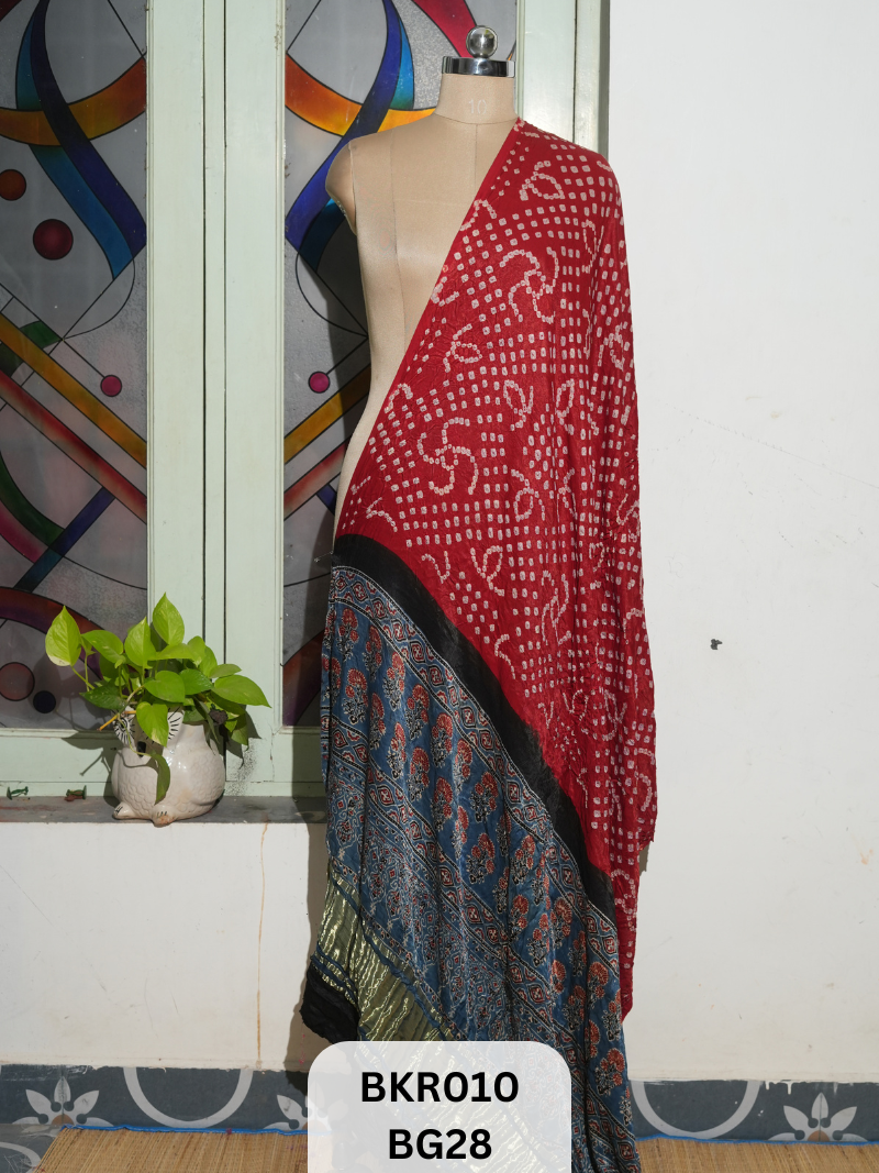 A: It’s a handcrafted cotton dupatta that uniquely combines Gujarati Bandhani (tie-dye) with Sindhi Ajrakh (natural block printing), representing two of India’s oldest textile traditions in one wearable art piece.