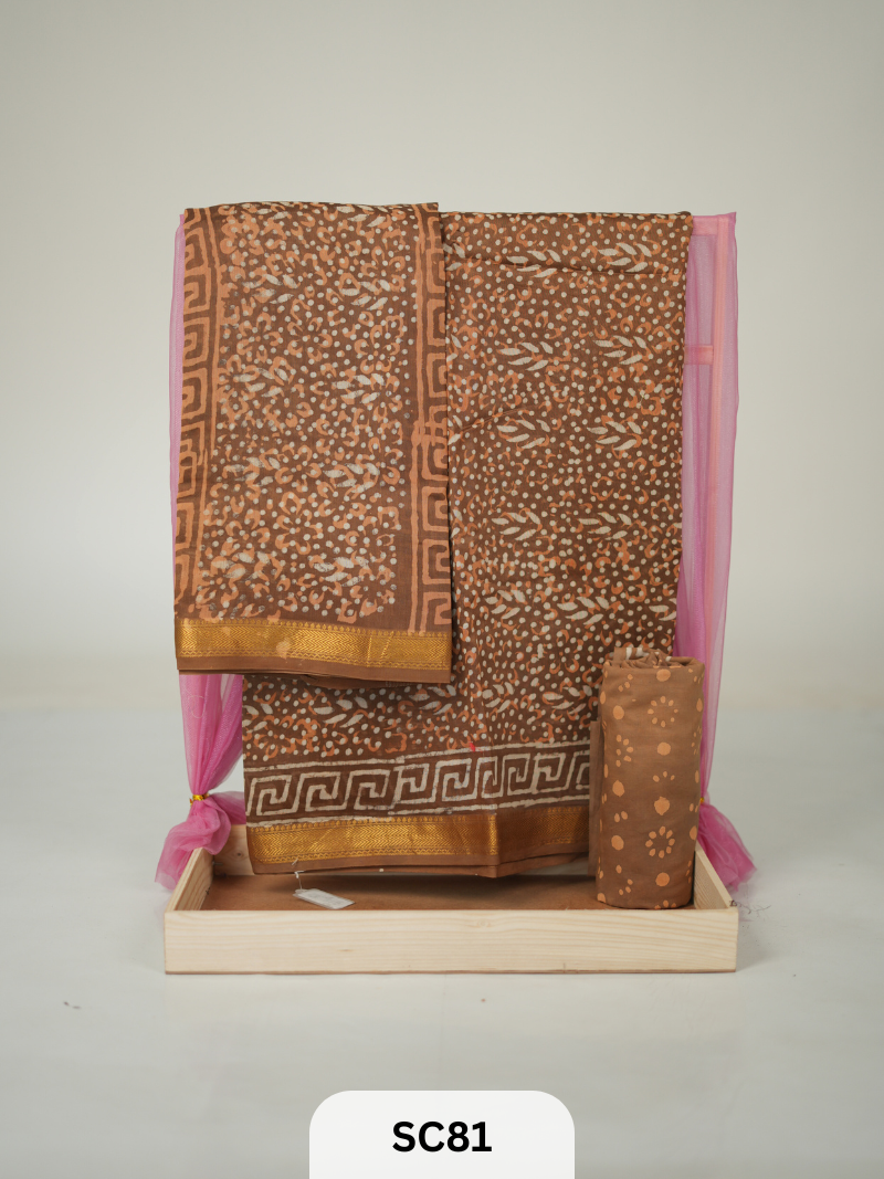 Originating from Maheshwar, Madhya Pradesh, Maheshwari sarees are known for their lightweight silk, reversible borders, and royal texture. Combined with the artistry of Jaipur’s hand block printing, this saree brings together two legendary Indian textile traditions—offering a regal yet contemporary drape.