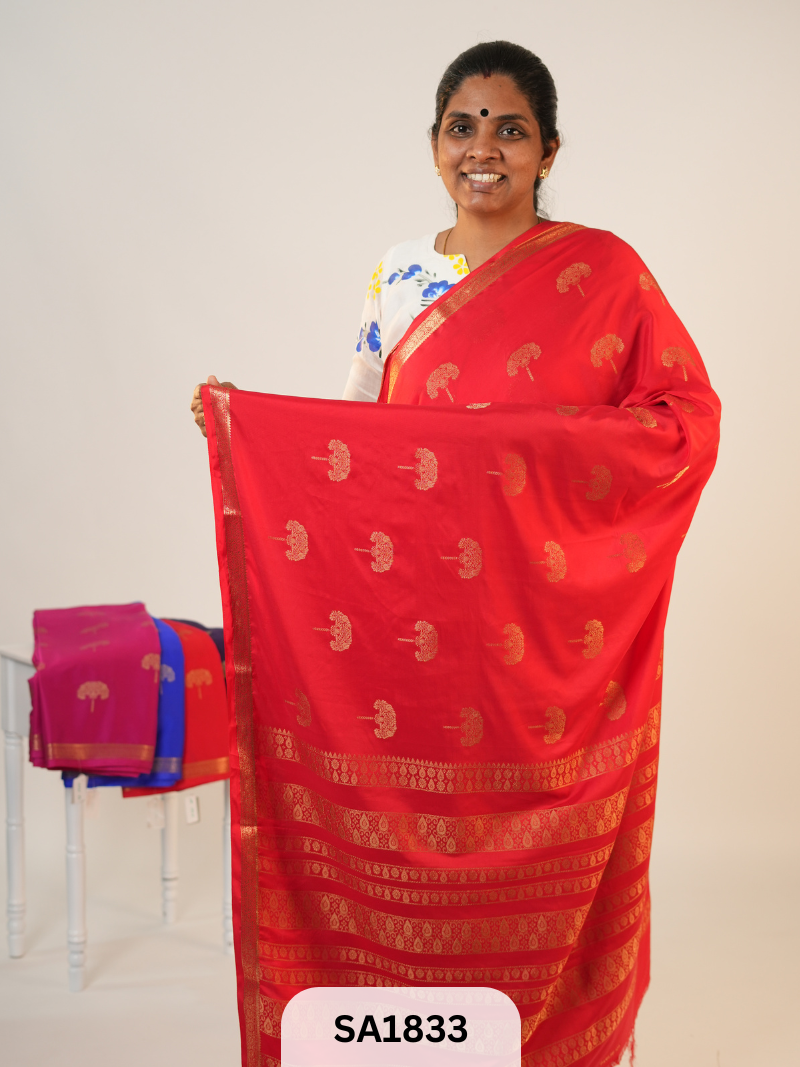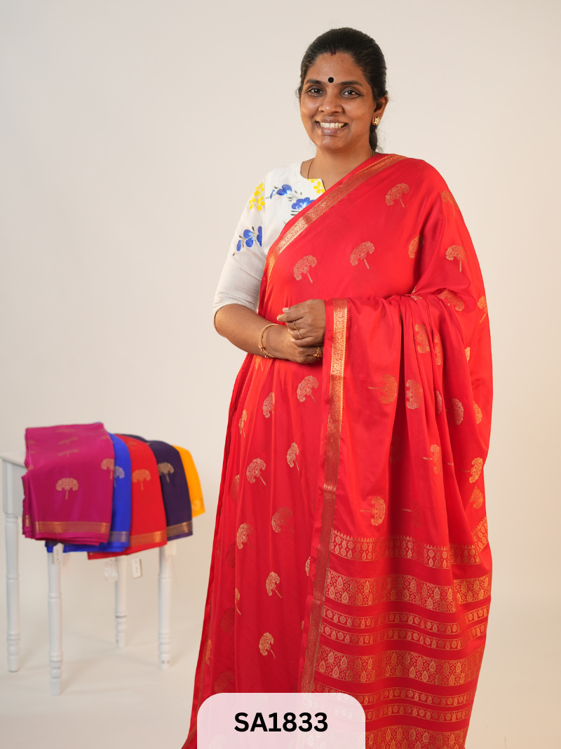 The Mysore Binny Crepe Saree traces its roots to the royal looms of Mysuru (Mysore), Karnataka—a region renowned since the 1930s for its fine silk weaving under the patronage of the Wadiyar dynasty. Originally produced at Binny Mills (established in 1936), these sarees emerged as a lighter, more affordable alternative to heavy Mysore silk, without compromising on sheen or sophistication. Woven with high-grade crepe silk, they became a favorite among modern South Indian women seeking comfort and class. At Saree Story with Shanmuga Priya & Azhagi, we honor this legacy by collaborating directly with certified weaver clusters to preserve authenticity, support artisans, and deliver timeless pieces that celebrate India’s textile soul.