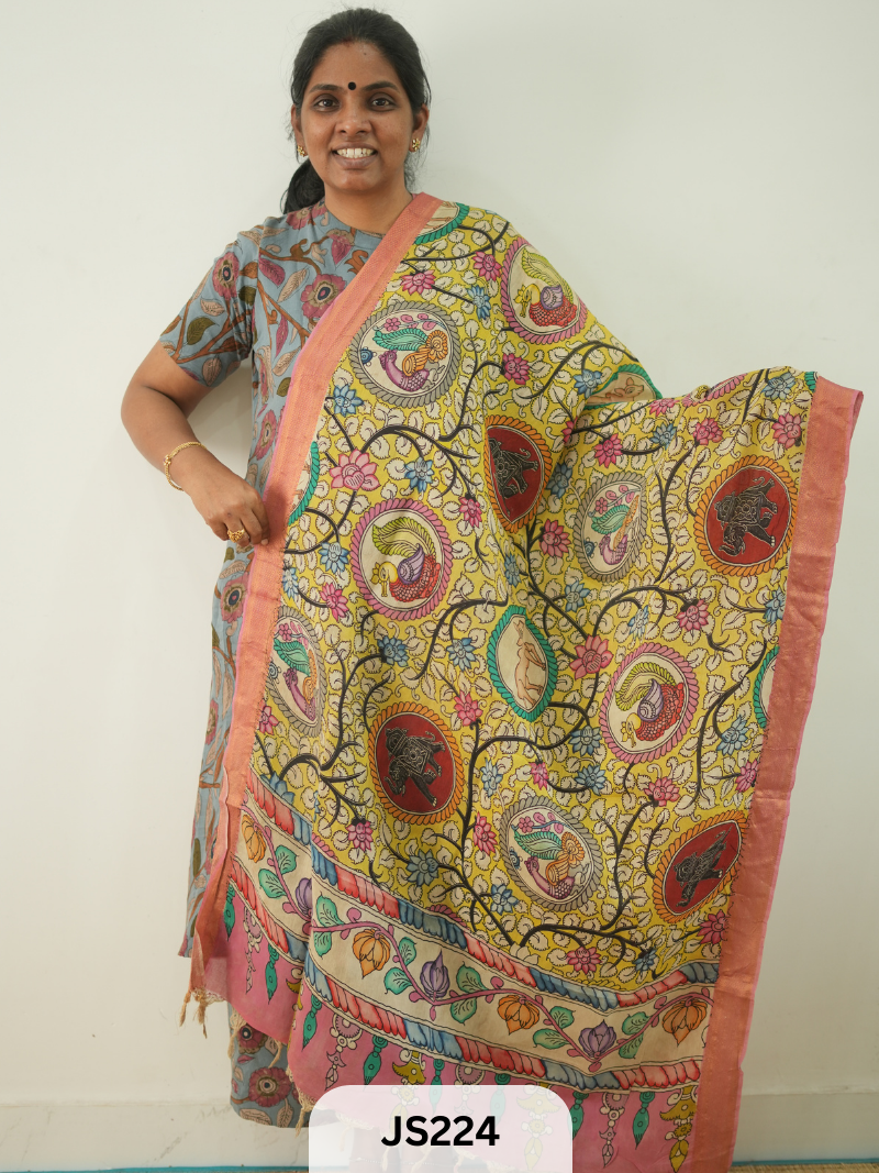 Explore Saree Story with Shanmuga Priya's collection of Kalamkari dupatta and discover a treasure trove of artistic masterpieces waiting to adorn your sarees.