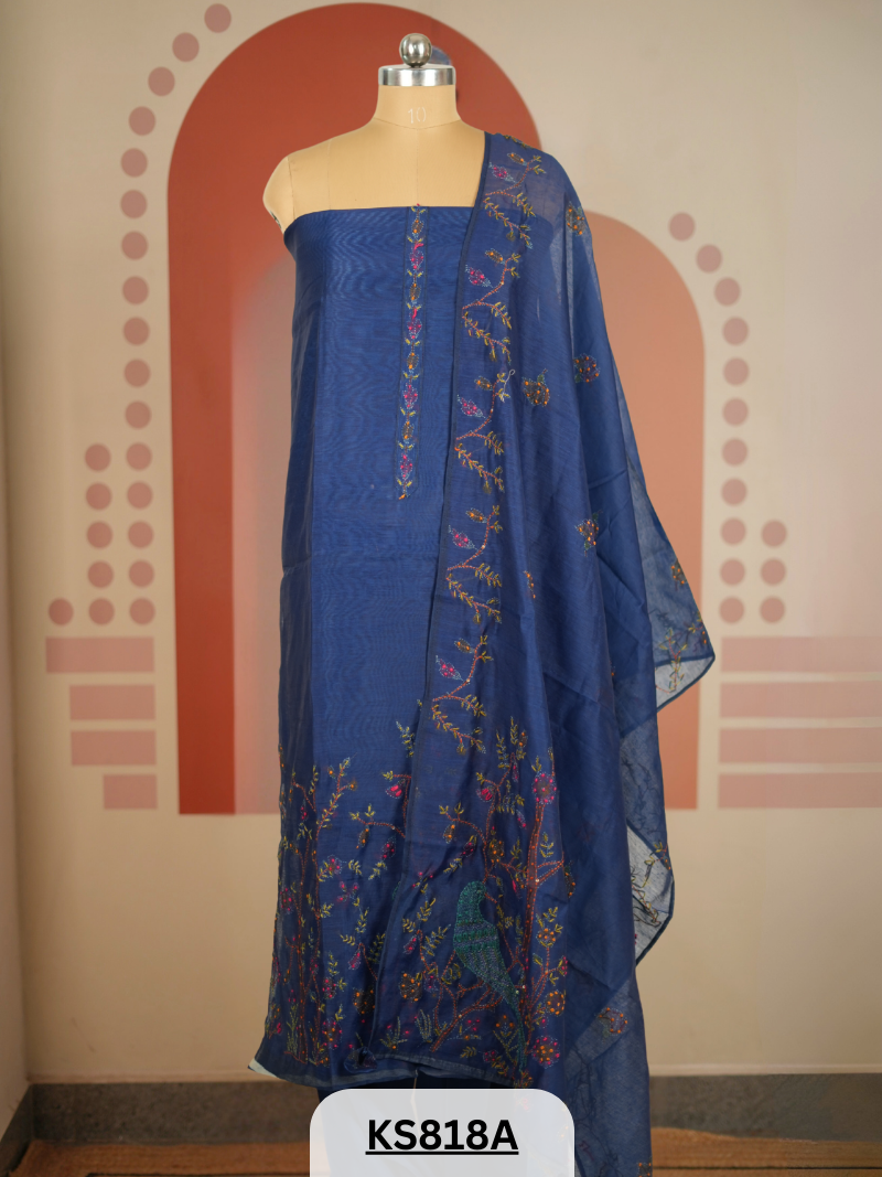 A: Yes. Depending on the design, the suit features hand embroidery, zari work, or hand-applied embellishments by skilled artisans—ensuring authenticity and uniqueness.